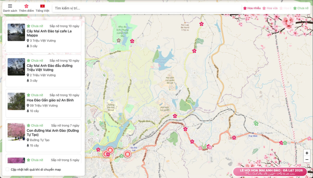 Chỉ sau vài ngày nắng ấm, sắc hồng của Mai Anh Đào đã chính thức "nhuộm" hồng phố núi. Bản đồ số check-in Mai Anh Đào - Dalatmap đang rực rỡ hơn bao giờ hết với hàng loạt điểm ghim báo hiệu hoa nở rộ. Nếu bạn đang ở Đà Lạt hoặc có kế hoạch du lịch, đừng bỏ lỡ "thời điểm vàng" bắt đầu từ hôm nay, 28/01/2026!
